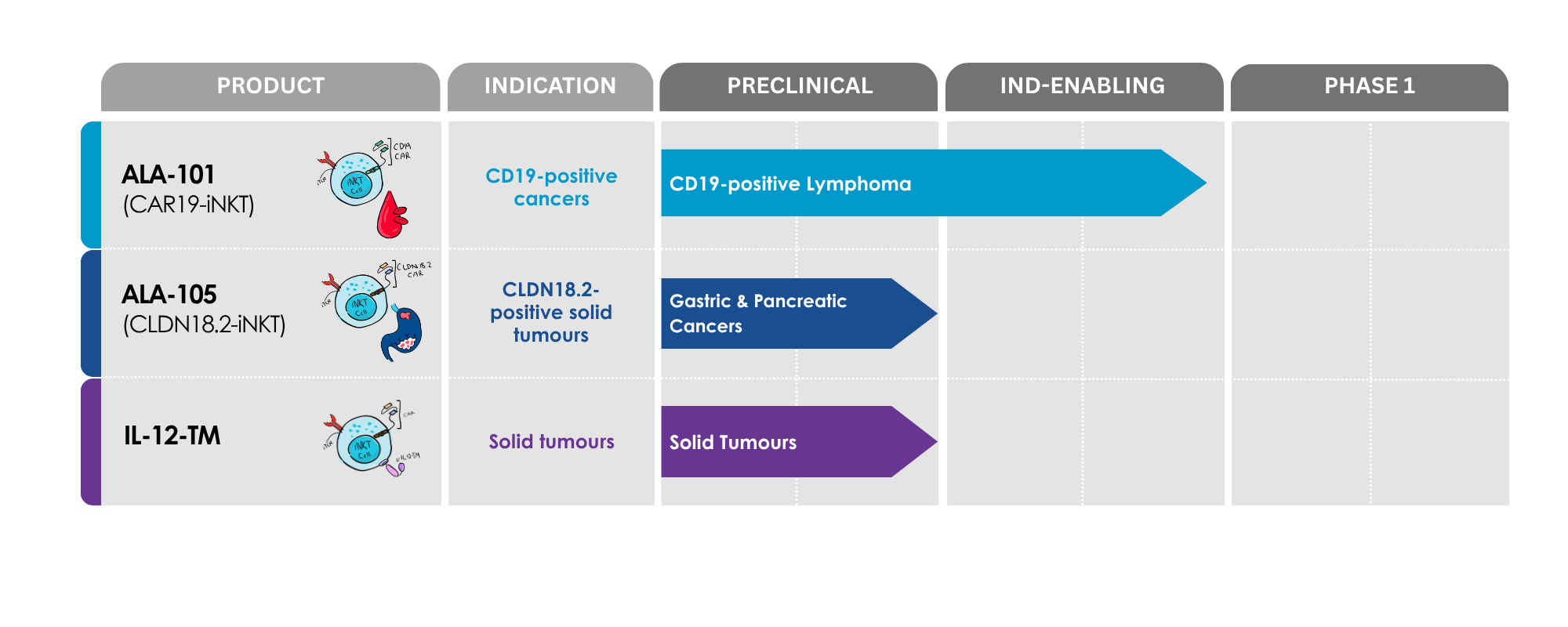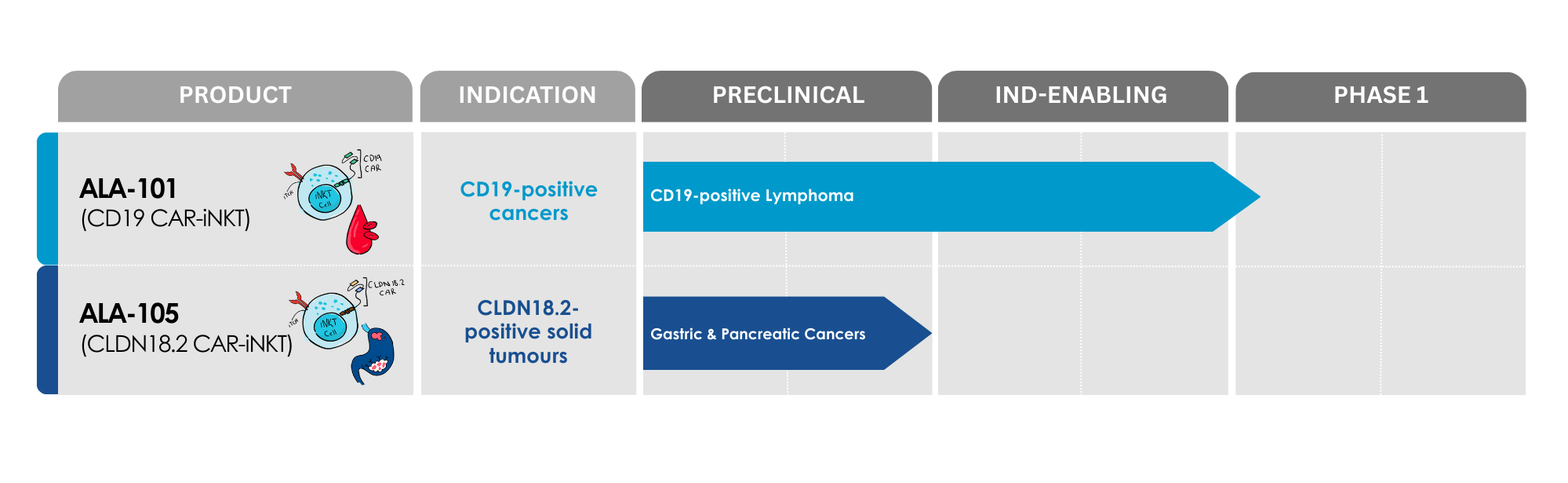 ALA-101 is a next-generation "off-the-shelf" CAR-iNKT cell therapy that targets CD19+ B cell lymphomas and leukaemias.
